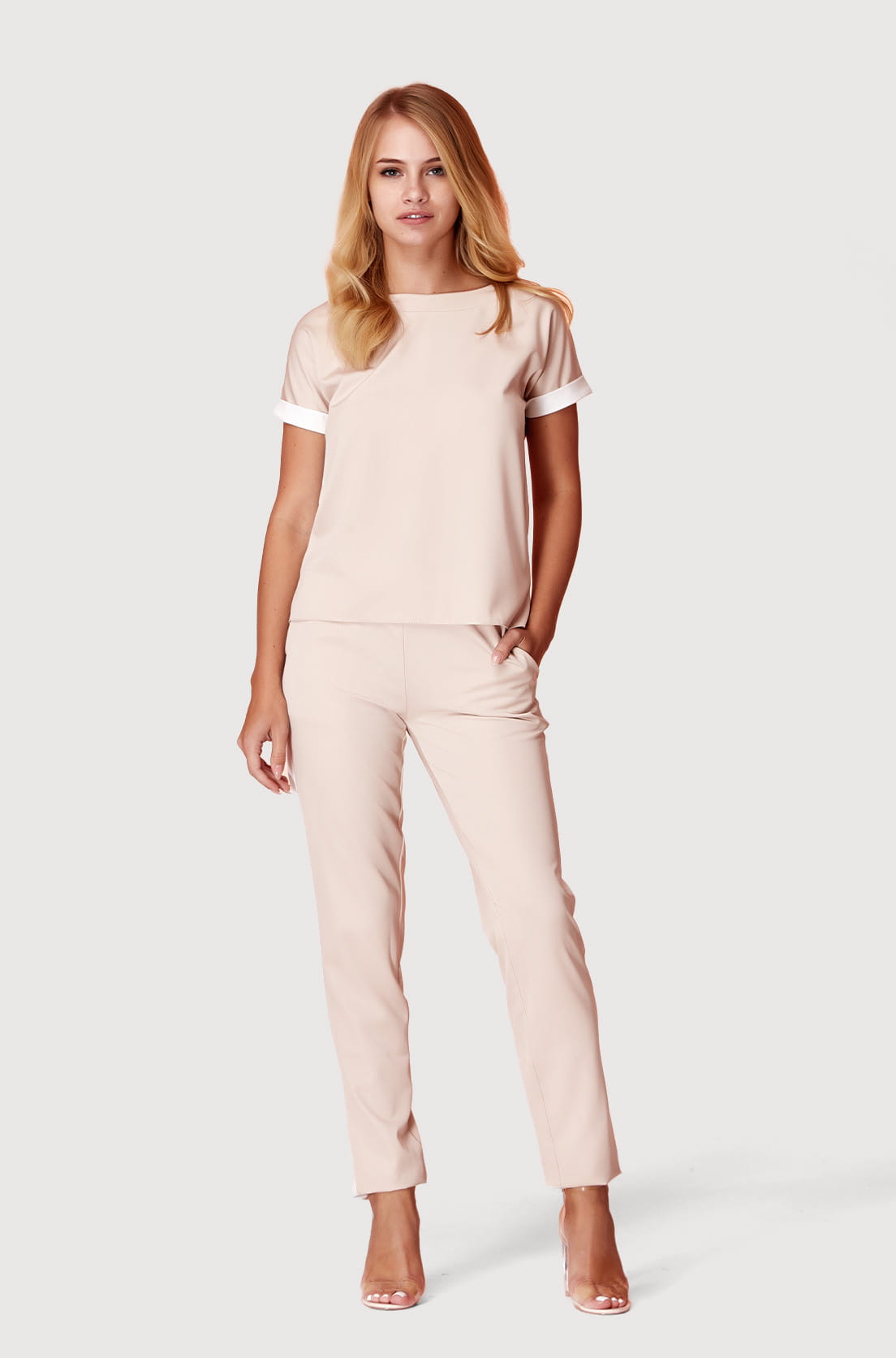 Zostały wykonane z nieprześwitującego materiału (bawełny z dodatkiem elastanu). Pomimo dopasowanego fasonu, posiadają kieszenie. Nasze legginsy to proste i wygodne ubranie, idealne na co dzień do pracy zdalnej i na długie spacery. Świetnie komponuje się zarówno z t-shirtem w tym samym kolorze, co tworzy spójną stylizację, jak i tuniką i długim swetrem.