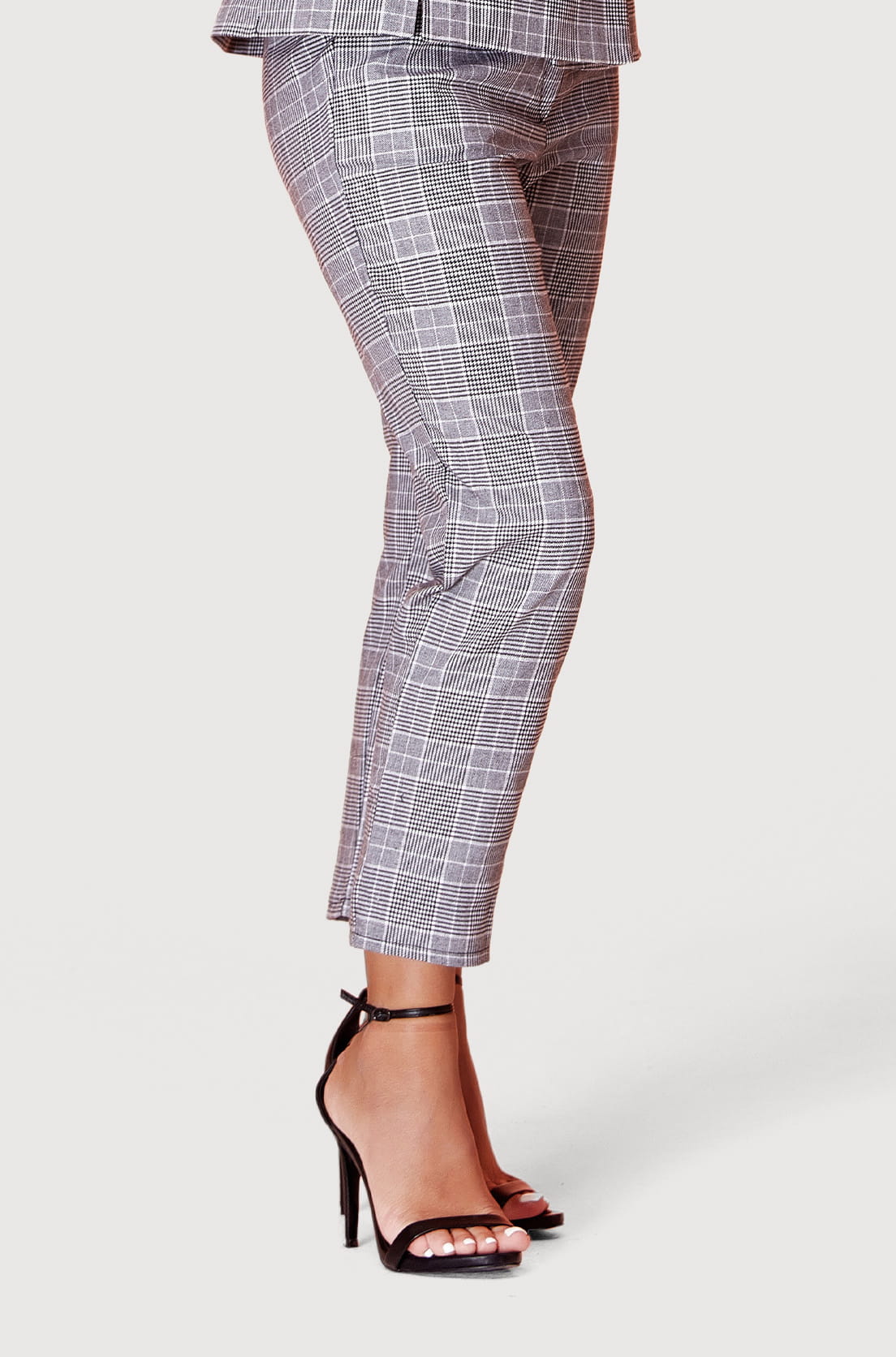 Klasyczne szare spodnie garniturowe w czarno-białą kratkę z domieszką wełny. Spodnie zostały wykonane z bardzo dobrego materiału, mającego w składzie 80% bawełny i 20% wełny. Charakteryzują się eleganckim prostym fasonem. Długość kończy się przed kostką, co nadaje im subtelnego wyrafinowania i sprawia, że prezentują się doskonale zarówno z eleganckimi szpilkami.
