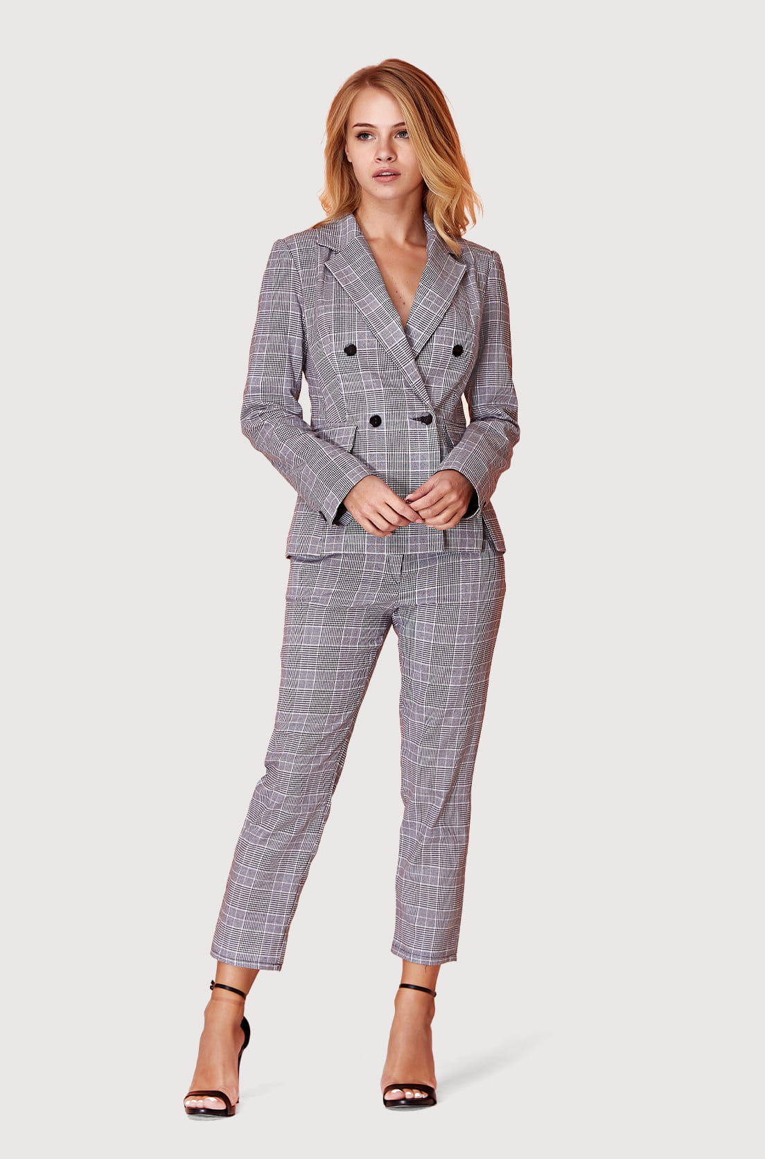 Możesz zestawić z marynarką z tego samego materiału, tworząc kompletny garnitur lub z gładką marynarką w kolorze szarym. Doskonale wyglądają również z obcisłym topem w kolorze złamanej bieli lub cielistym.